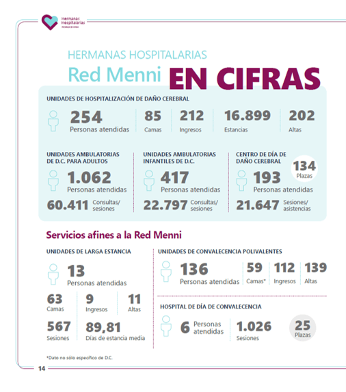 La Red Menni de Daño Cerebral cuenta con un total de 366 camas repartidas en 6 centros que han creado servicios especializados y afines para la rehabilitación y el cuidado de las personas con daño cerebral. Estos centros son el Hospital Beata María Ana de Madrid, el Hospital Benito Menni de Valladolid, el Hospital Aita Menni de Mondragón, el Centro Hospitalario Padre Menni de Santander, Hermanas Hospitalarias Tenerife y Hermanas Hospitalarias Valencia.